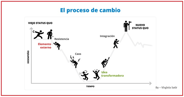 Y es que querer afrontar un proceso de cambio, sin una estrategia clara de gestión del cambio sin duda es un grave error. Para entender un poco más esta última línea que expreso, mi querido amigo lector, vamos a remitirnos al enfoque que nos plantea la Dra. Virginia Satir, sobre lo que es un proceso de cambio: «Todos los seres humanos llevan consigo todos los recursos que necesitan para florecer. El proceso de acompañamiento consiste sólo en ayudar a las personas a tener acceso y aprender a utilizar sus recursos». Para la Doctora Satir, el sistema es donde todos reciben influencias e influyen en todo; así cualquier situación es resultado de diversos estímulos y múltiples efectos. Por lo cual el proceso de cambio se divide en tres etapas: Hacer contacto, Caos e Integración.