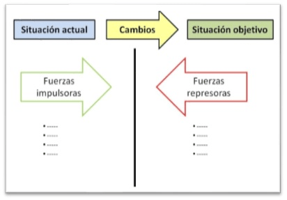La práctica del Análisis del campo de fuerzas desarrollada por Kurt Lewin y proporciona un marco para observar las fuerzas que afectan a una situación problemática; Identificando, tanto Las fuerzas impulsoras como las fuerzas represoras. Las fuerzas impulsoras o positivas son las que traen cambios a la situación actual y las fuerzas represoras o negativas evitan que el cambio ocurra.