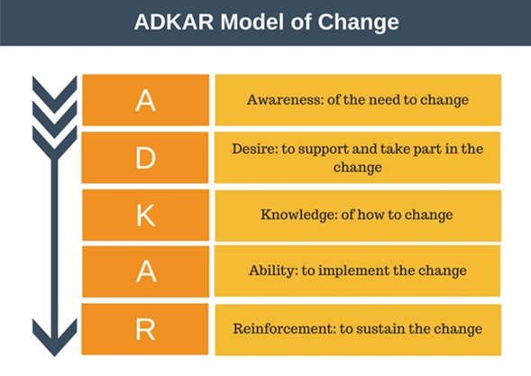 ADKAR es un modelo para gestión de cambio organizacional y se fundamenta en la medición individual que permite que cada individuo supere las etapas que lo componen; ADKAR tiene dos dimensiones bastante interesantes que son Negocio y Personas. Desde el punto de vista de negocio ADKAR tiene una visión compuesta por 4 etapas que son: conocer y entender La Necesidad del Negocio, Conceptualizar y Diseñar del plan del proceso de cambio, Implementar el cambio y todo lo que suceda en la Post-Implementación del cambio; en cuanto a la dimensión de las personas, ADKAR plantea 5 Condiciones que deben satisfacerse para que progrese el viaje del cambio; si cualquiera de estas es débil, el cambio se detendrá y fallará. Las 5 condiciones son: Awareness (Conciencia), Desire (Deseo), Knowledge (Conocimiento), Ability (Habilidad) y Reinforcement (Refuerzo).