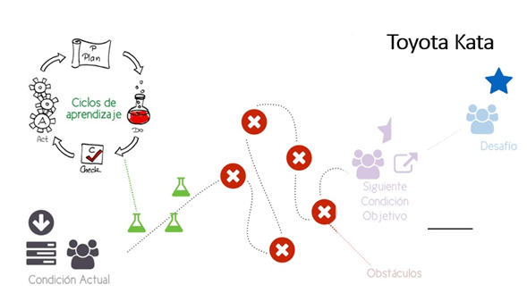 La idea es ir preparando los distintos experimentos a realizar, ejecutarlos y validar si se alcanzó el objetivo o en términos de Kata, la siguiente condición objetivo y continuar así avanzando. Sin duda, las pequeñas acciones a realizar para alcanzar la siguiente condición objetivo son la base del aprendizaje.
