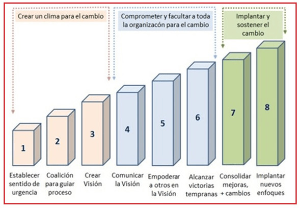 En la imagen podemos observar, como Kotter nos plantea tres dimensiones que son: crear un clima para el cambio, comprometer y facultar a toda la organización para el cambio e implantar y sostener el cambio. Partiendo con la creación del sentido de urgencia, para así; crear un punto de ebullición que permita las condiciones iniciales con las que se creara conciencia de la necesidad de realizar el cambio, e ir pasando por las distintas etapas, hasta llegar al punto, en donde los nuevos enfoques serán implantados en una cultura ya evolucionada.