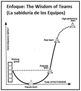 En el Enfoque: The Wisdom of Teams de Jon R. Katzenbach y Douglas K. Smith, se plantea la siguiente pregunta: ¿Qué marca la diferencia entre un equipo que se desempeña bien y otro que no? En su libro, manifiestan que existe una disciplina básica que hace que los equipos funcionen; además que las personas usan la palabra “equipo” tan vagamente que ésta se interpone en el camino del aprendizaje. y que la aplicación de la disciplina conduce al alto desempeño. Otras de las conclusiones importantes que expresan Jon R. Katzenbach y Douglas K. Smith, es que los valores del trabajo en equipo no son en sí exclusivos de los equipos, como tampoco son suficientes para asegurar el desempeño de un equipo y que un equipo tampoco es cualquier grupo que trabaje en conjunto.