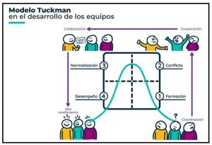 El modelo de Tuckman sostiene que mientras el equipo pasa por las etapas y va adquiriendo madurez y habilidades, así como buena comunicación interna, va mejorando en diferentes aspectos y se va consolidando como un verdadero equipo. Dichas etapas del modelo de Tuckman son: Forming (Formación – En esta etapa, los miembros del equipo se comportan de forma independiente. Aún se están conociendo unos a otros por lo que en general hay cortesía y buena voluntad. Sin embargo, la confianza mutua aún no se ha establecido. Las discusiones probablemente se centren en definir el alcance de la tarea en cuestión y cómo abordarla. El equipo depende de un líder para su orientación y dirección), Storming (Enfrentamiento/Conflicto – En esta etapa Los miembros del equipo comienzan a sugerir ideas y a competir entre sí. La gente comienza a formarse una opinión sobre el carácter de los demás en el equipo. Durante esta etapa, las relaciones se pueden crear o romper. Los desacuerdos y los choques de personalidad deben resolverse. De lo contrario, la motivación disminuirá. Por otro lado, si el equipo está demasiado concentrado en alcanzar el consenso, podría acordar un plan defectuoso simplemente para mantener al equipo unido), Norming (Normalización – en esta etapa, existe un mayor acuerdo y consenso en la toma de decisiones. Los roles y las responsabilidades se aclaran y el equipo avanza hacia prácticas de trabajo más armoniosas. El debate se centra en el desarrollo de procesos de trabajo. El equipo es más consciente de la competencia y emerge un mayor espíritu de cooperación), Performing(Alto Desempeño – Esta es una fase de alto rendimiento. El equipo entiende su propósito y sus objetivos y está motivado. Los miembros del equipo son autónomos. Además, pueden manejar la toma de decisiones sin la presencia del líder, de acuerdo con los criterios acordados. Los desacuerdos se pueden resolver positivamente dentro del equipo.), por ultimo Tuckman propone la etapa de Adjourning(Finalización/Disolución – En esta etapa se trazan nuevos objetivos y planes, asegurando que las contribuciones pasadas tanto de las personas como del equipo estén completamente identificadas y reconocidas).