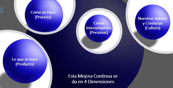 - Existen 4 dimensiones de mejora continua (Lo que se hace –Producto-, Como se hace -el proceso-, Como interactuamos -Personas-, Nuestros Valores y Creencias -Cultura-). Y que la búsqueda en las 4 dimensiones hace que la mejora sea integral