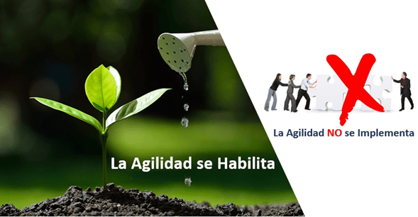 Lo primero que tenemos que tener claro es el hecho que la agilidad NO se implementa, la Agilidad se habilita: Esto es importante tenerlo claro desde el comienzo, porque lo que realmente implementamos son prácticas, técnicas, herramientas y framework, con los que buscamos apalancar la habilitación de la agilidad en la organización. Sin duda cuando esto no se tiene claro, se comete el error de pensar que como ya se trabaja bajo sprint, se hacen dailys, o se está trabajando bajo un framework, ya se es una organización ágil y realmente va mucho más allá.