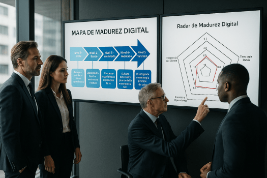 - Crear el mapa de madurez y un plan de acción. El análisis de los resultados se plasma en el mapa de madurez digital. Este mapa visual muestra el estado actual de la empresa y sirve de base para desarrollar una hoja de ruta. Para esto, se utiliza una herramienta gráfica (como un gráfico de radar o una tabla de puntajes) para visualizar las puntuaciones. El gráfico de radar es particularmente útil porque permite ver de un vistazo qué tan balanceado está el nivel de madurez en las diferentes dimensiones.